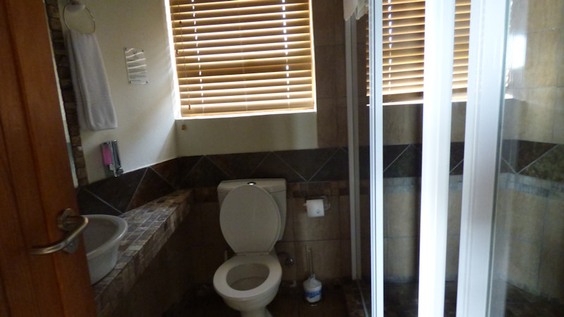 slaapkamer met dubbel bed, badkamer, veranda. |