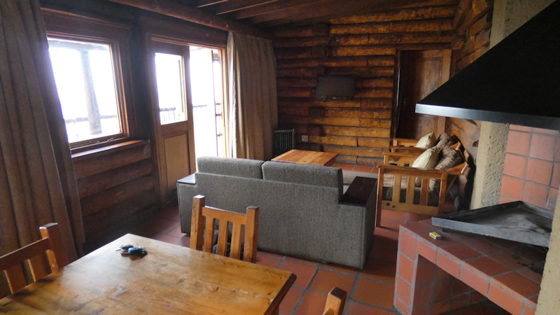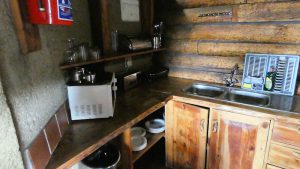 Dit aparte camp ligt op 2230 m hoogte. Er zijn 4 tweepersoons en 4 vierpersoonsblokhutten; in iedere bungalow kunnen ook nog 2 kinderen op een slaapbank. Het uitzicht is enorm weids. Er is een aparte slaapkamer met een erg smal 2-persoonsbed. Hierachter ligt een grote badkamer met inloopdouche. De open keuken heeft o.a. een oven, kookplaat en magnetron en een voorraadje koffie en thee. Er is een open haard en een veranda met braaimogelijkheid. In de huiskamer staat een kleine bank en 2 leunstoelen, die we ook naar het balkon sleepten (in een schaduwplek) want de houten terrasstoeltjes zijn zeer oncomfortabel. Het kamp is te bereiken via een smal weggetje vanaf de hoofdweg. Op die weg is een hide waar je lammergieren zou kunnen zien die op neergelegde karkassen afkomen. Je hoort hooguit een enkele keer je buren als ze praten op het balkon, verder volledige stilte.